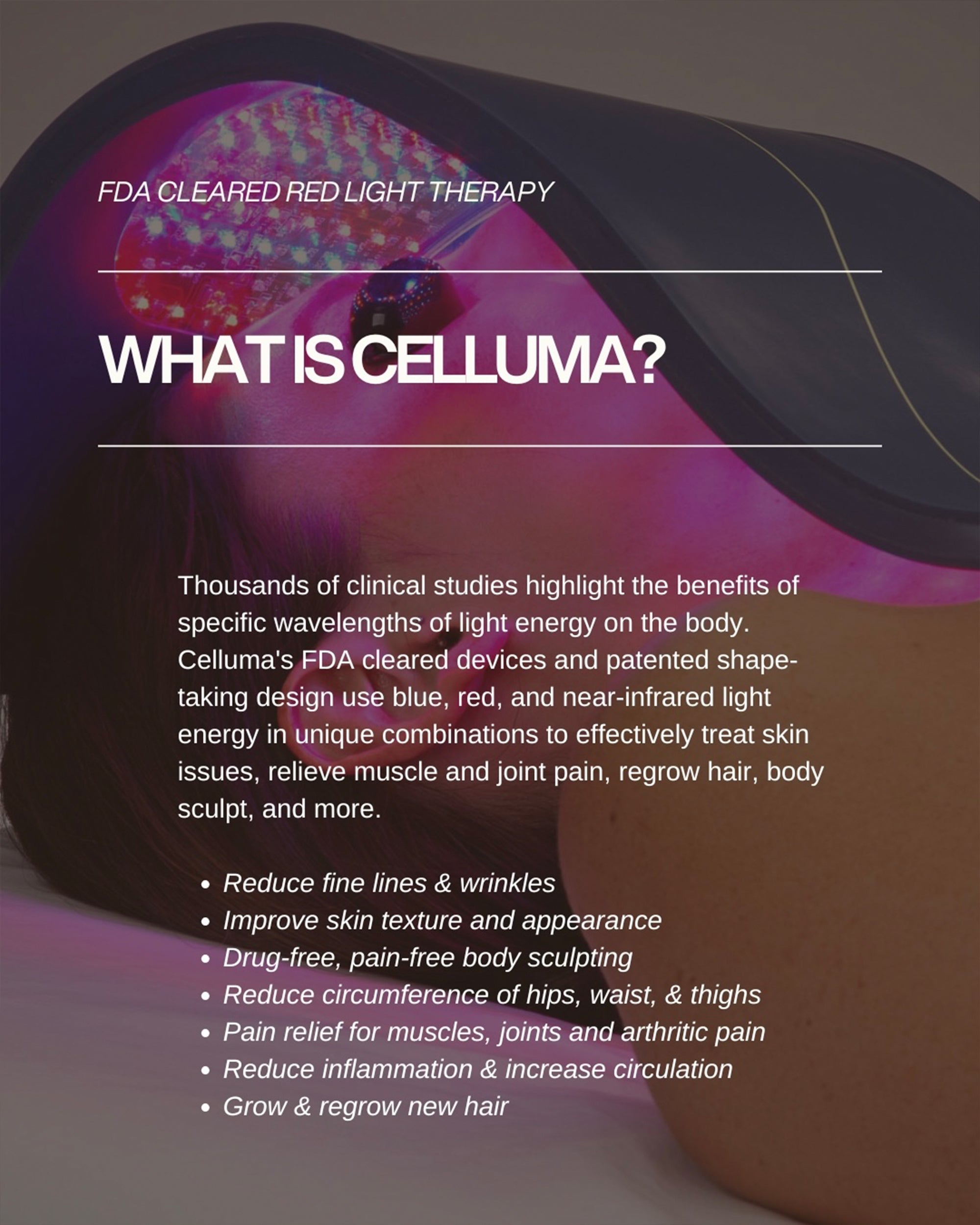 - After your 60 minute SFL treatment, you will lay under the Celluma red light therapy mat for 15 minutes to amplify your results