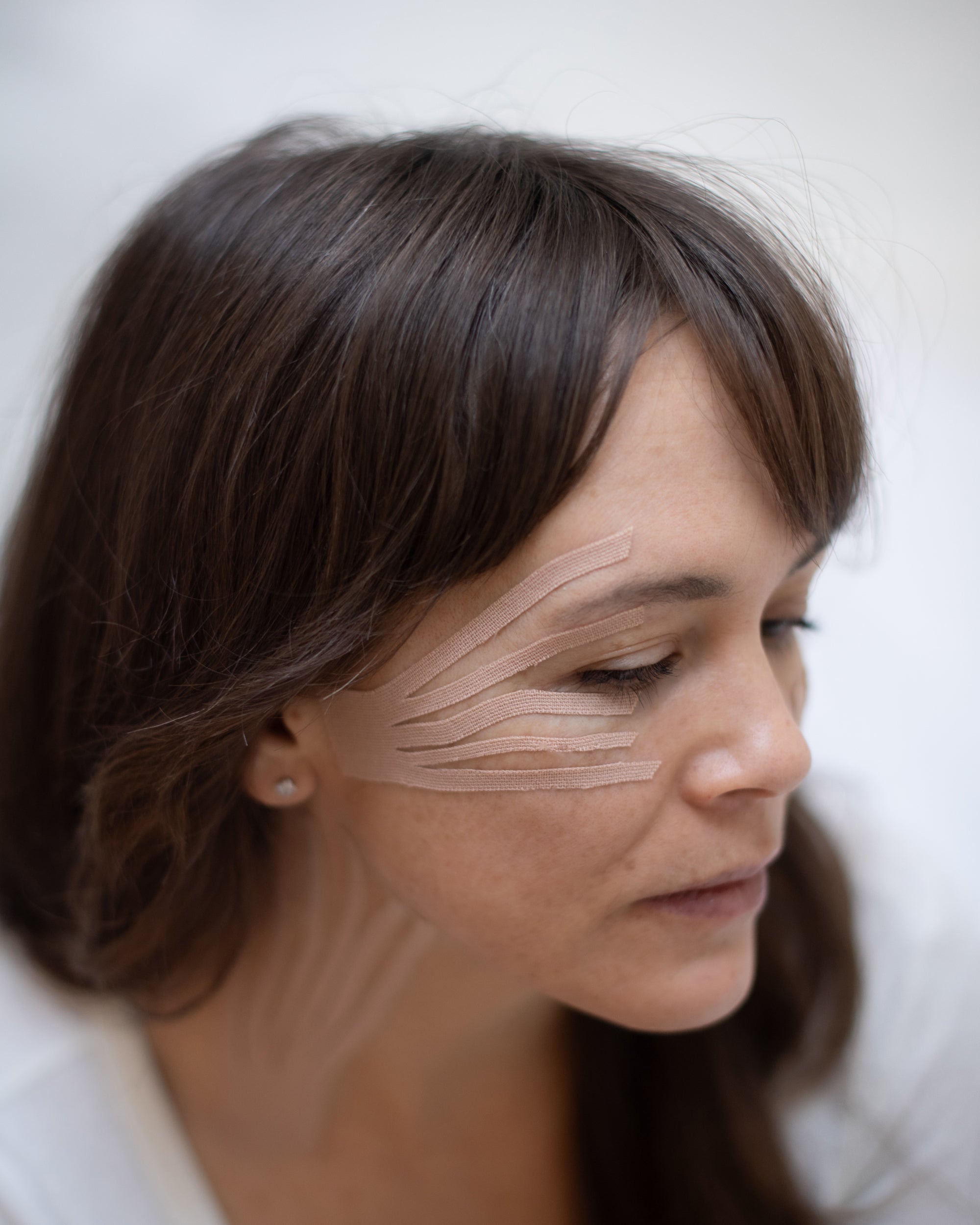 As an optional enhancement to your Sculptural Face Lifting session, you can add customized face taping to amplify your results. Once the lymph is opened and the face has been smoothed during your SFL session, it’s the perfect time to apply face tape. This method works by subtly lifting and separating the dermis from the epidermis, which helps hydrate the superficial fascia, encourages collagen production, and gradually softens static wrinkles. Emilee uses pure cotton Japanese kinesiology tape with a gentle adhesive, designed for comfort and effectiveness. You’ll wear the tape for 3–10 hours, then remove it to reveal an even more refreshed, lifted appearance.